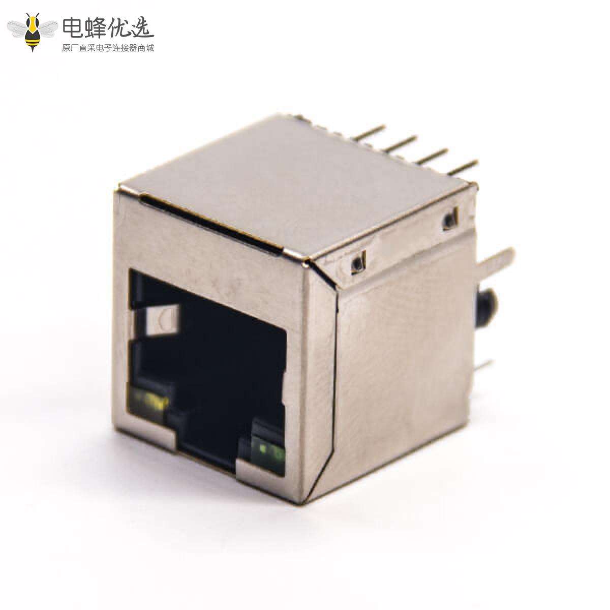 RJ45插座,8P8C,单端口,1*1,直式180°,触头镀金,插孔,PCB板安装,带屏蔽,带灯,不带滤波;