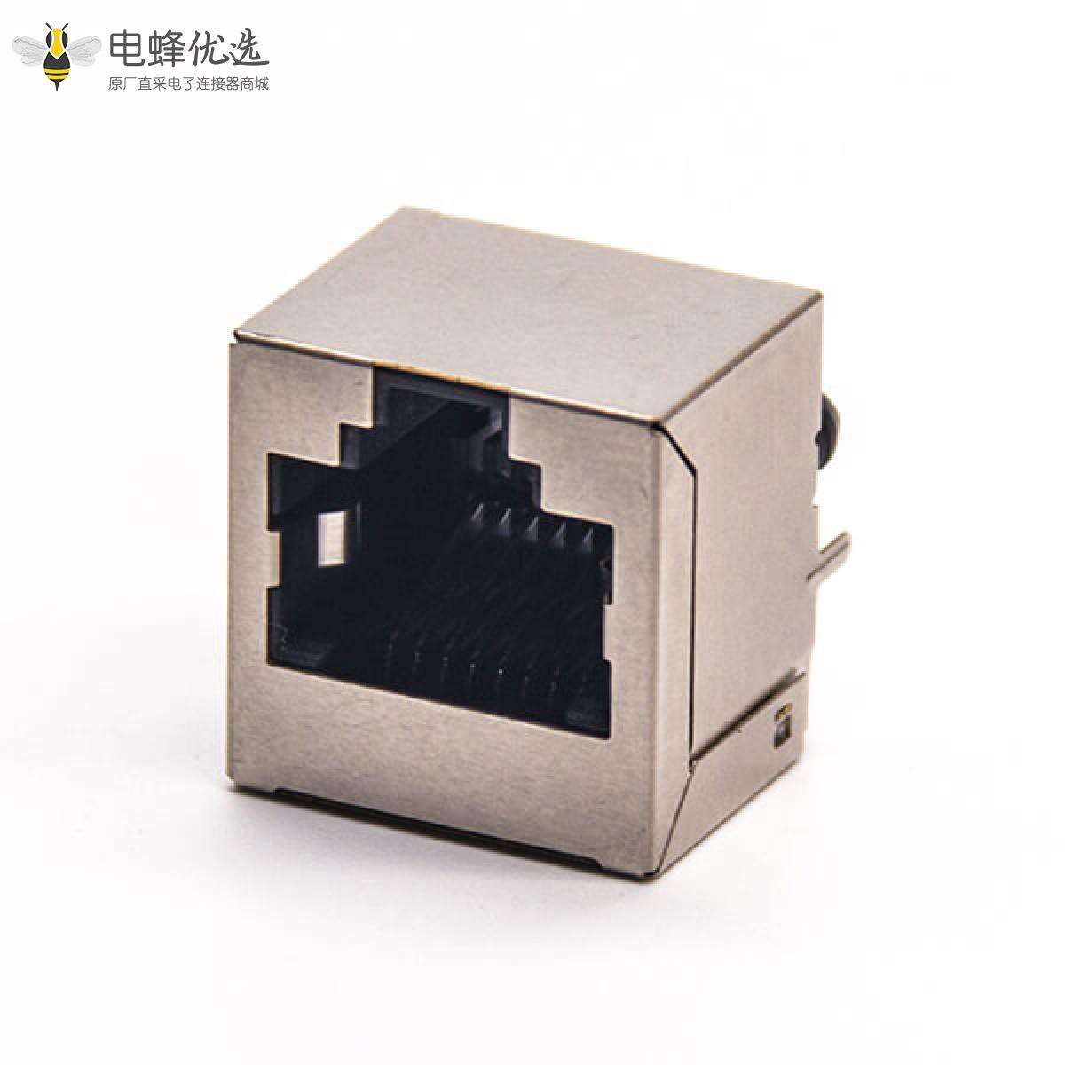 RJ45插座,8P8C,单端口,1*1,弯式90°,触头镀金,插孔,PCB板安装,带屏蔽,不带灯,不带滤波;