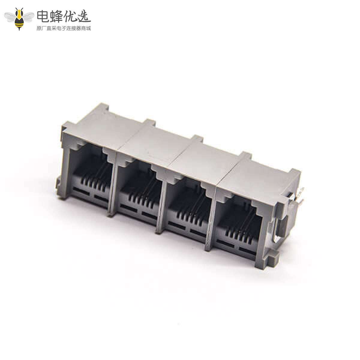 RJ11插座,6P2C,4端口,1*4,弯式90°,触头镀金,插孔,PCB板安装,非屏蔽,不带灯,不带滤波;