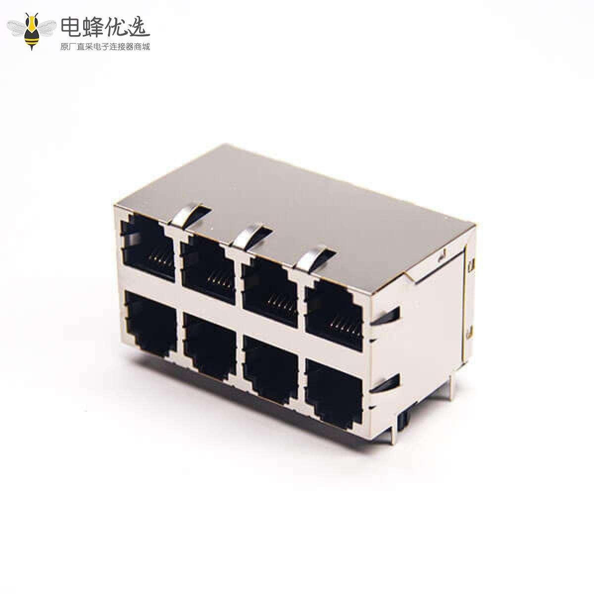 RJ45插座,8P8C,8端口,2*4,弯式90°,触头镀金,插孔,PCB板安装,带屏蔽,不带灯,不带滤波;