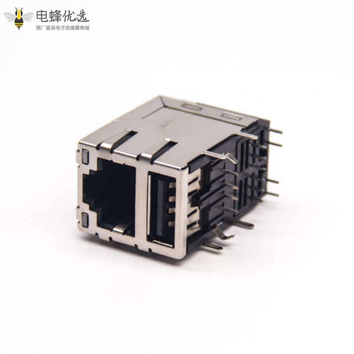 RJ45+Single USB,8P8C,2端口,2*1,弯式90°,触头镀金,插孔,PCB板安装,带屏蔽,带灯,不带滤波;