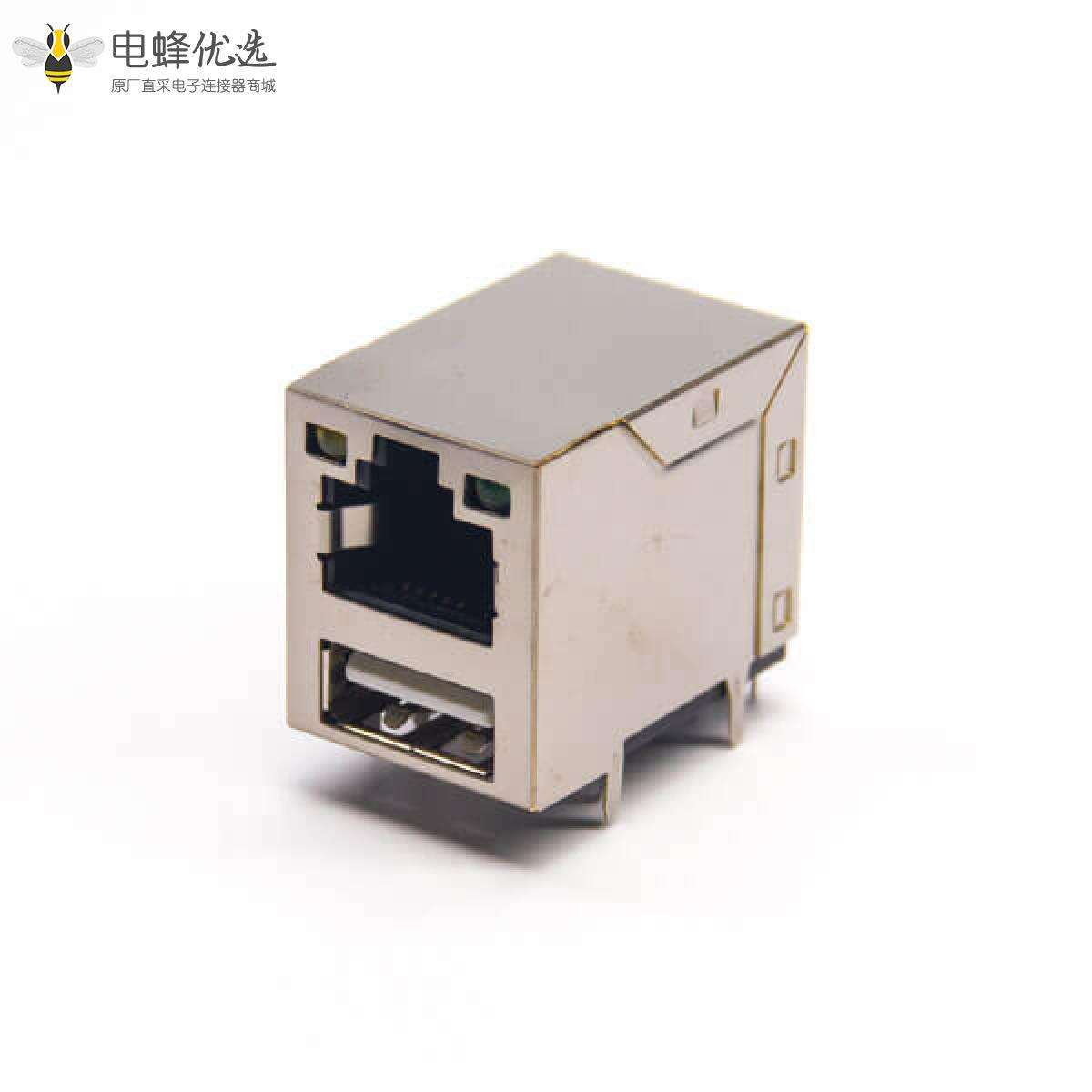 RJ45+Single USB,8P8C,2端口,2*1,弯式90°,触头镀金,插孔,PCB板安装,带屏蔽,带灯,不带滤波;