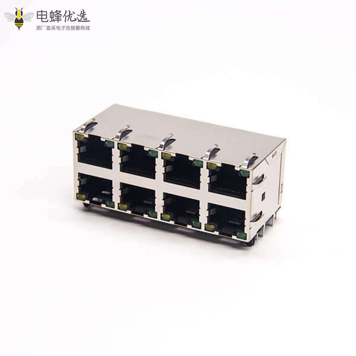 RJ45插座,8P8C,8端口,2*4,弯式90°,触头镀金,插孔,PCB板安装,带屏蔽,带灯,不带滤波;