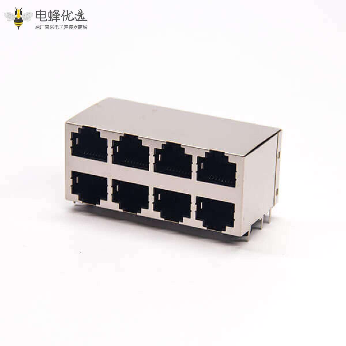RJ45插座,8P8C,8端口,2*4,弯式90°,触头镀金,插孔,PCB板安装,带屏蔽,不带灯,不带滤波;