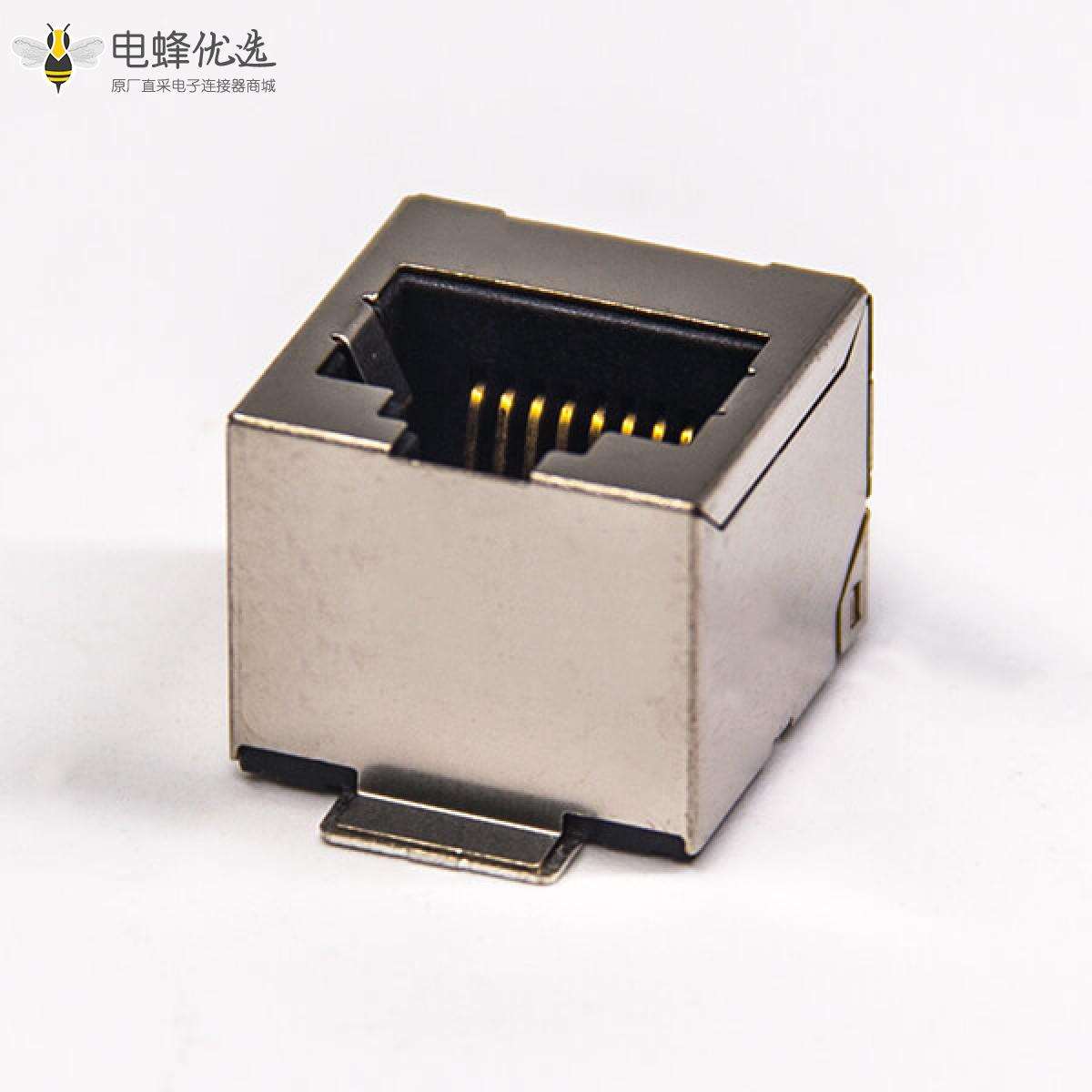 RJ45插座,8P8C,单端口,1*1,直式180°,触头镀金,贴板,PCB板安装,带屏蔽,不带灯,不带滤波;
