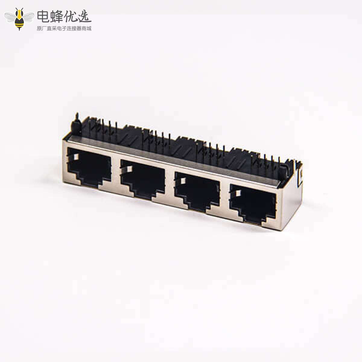 RJ45插座,8P8C,4端口,1*2,弯式90°,触头镀金,插板,PCB板安装,带屏蔽,不带灯,不带滤波;
