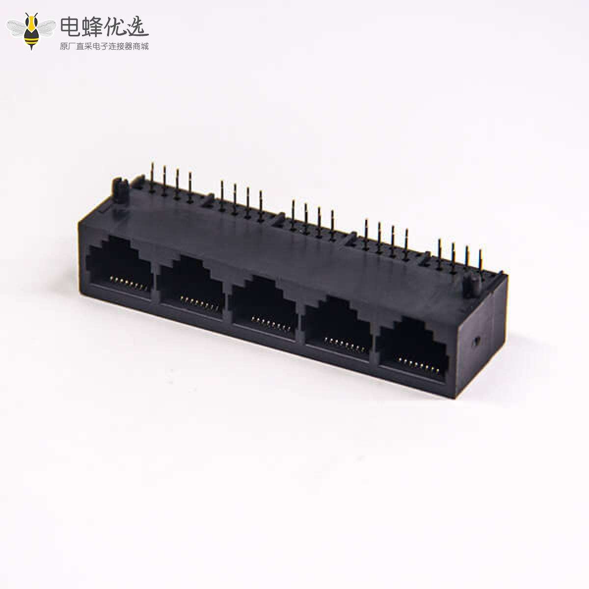 RJ45插座,8P8C,5端口,1*5,弯式90°,触头镀金,插板,PCB板安装,不带屏蔽,不带灯,不带滤波;