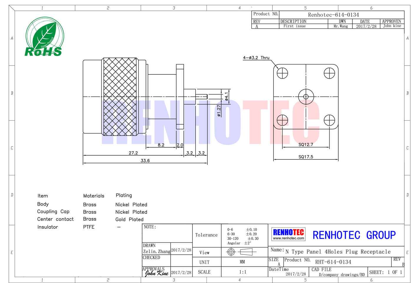 - n连接器,公头,50欧,直式,4孔法兰,面板安装;