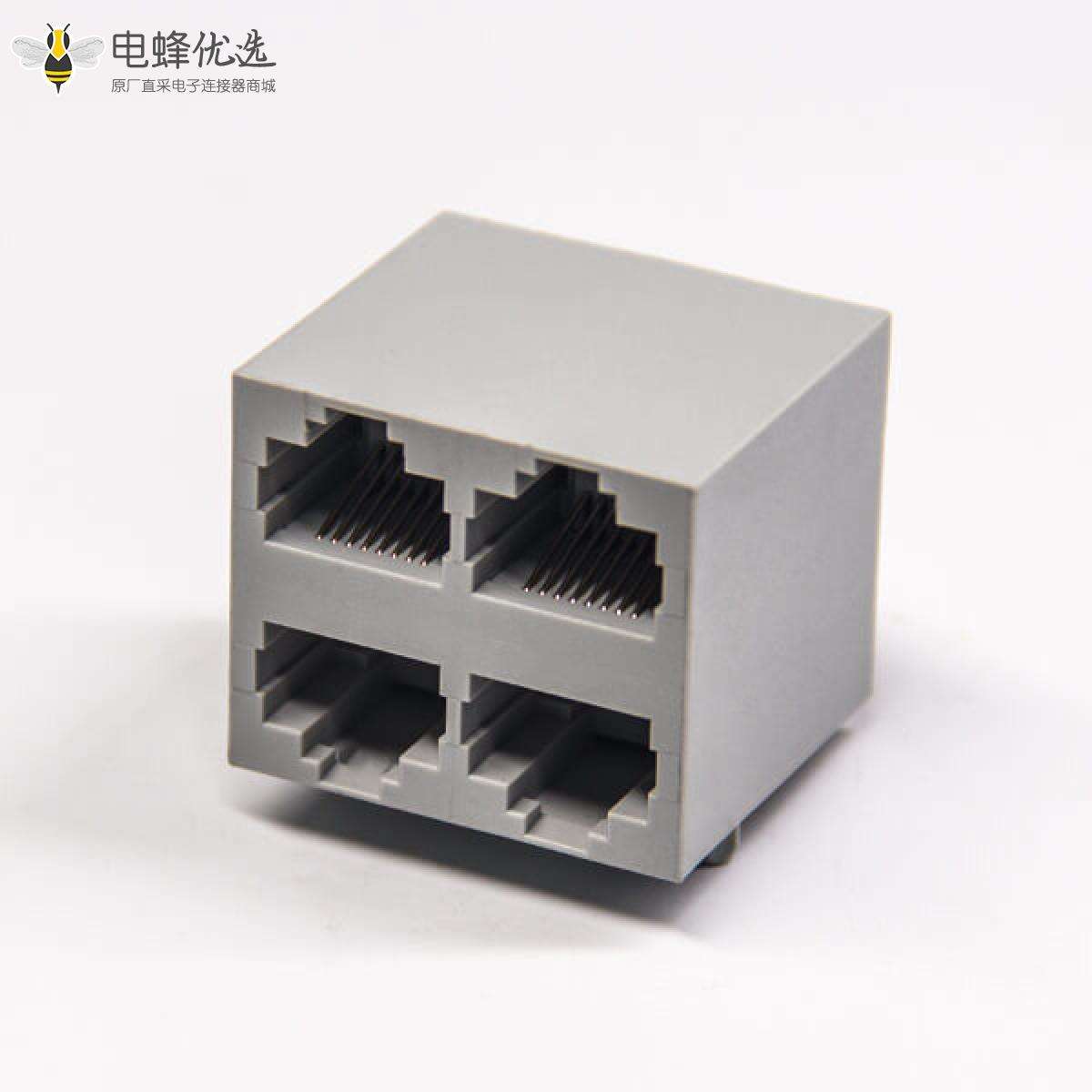 RJ45插座,8P8C,4端口,2*2,弯式90°,触头镀金,插板,PCB板安装,不带屏蔽,不带灯,不带滤波;