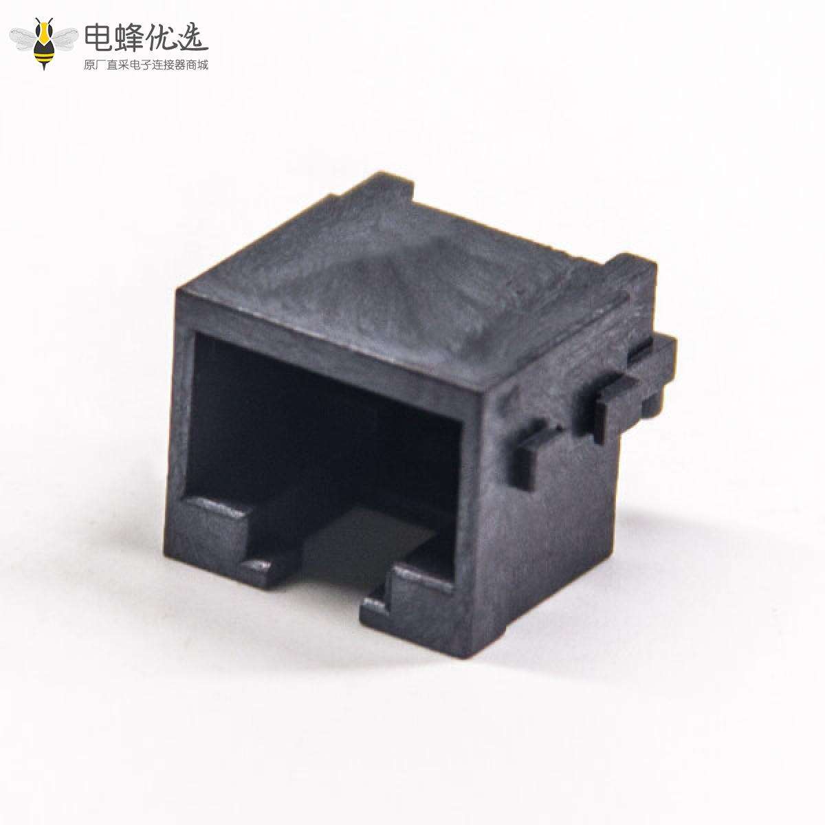 RJ45插座,8p8c,单端口,1*1,弯式90°,触头镀金,沉板贴板,PCB板安装,非屏蔽,不带灯,不带滤波;