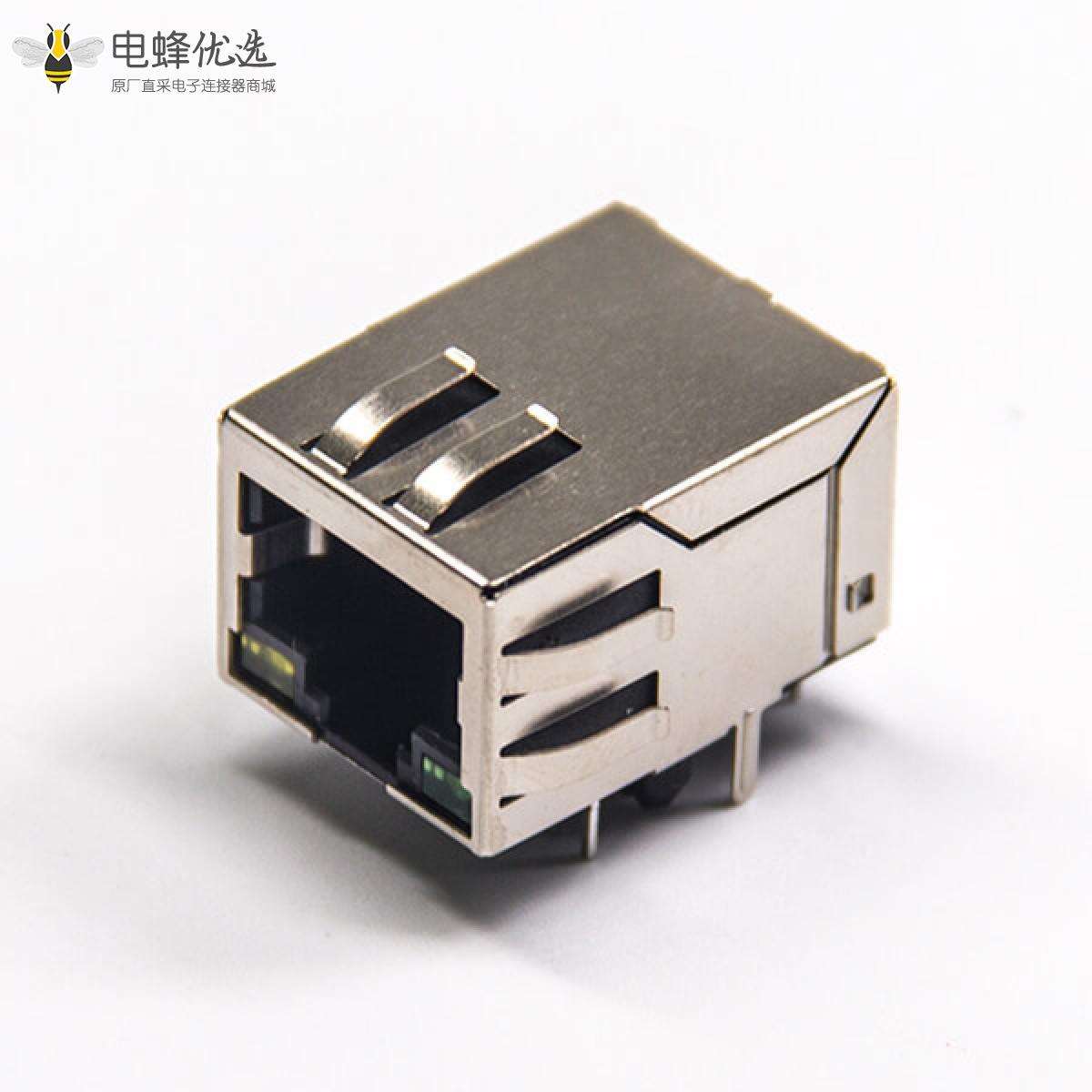 RJ45插座,8p8c,单端口,1*1,弯式90º,触头镀金,插孔,PCB板安装,带屏蔽,带灯,不带滤波;