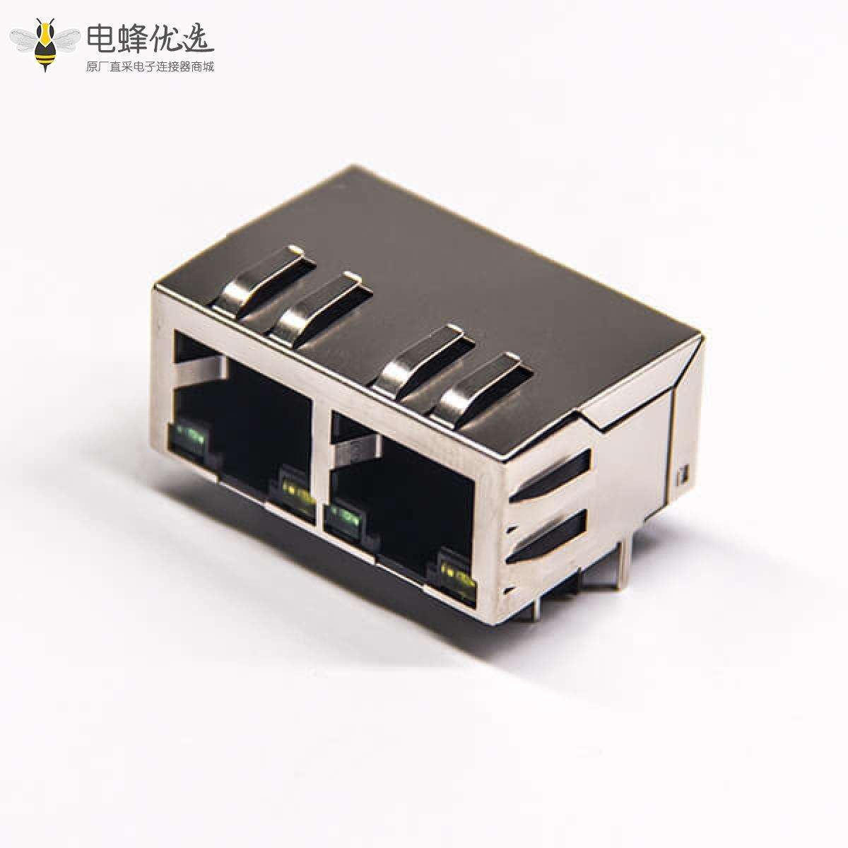 RJ45插座,8p8c,2端口,1*2,弯式90º,触头镀金,插孔,PCB板安装,带屏蔽,带灯,带滤波;