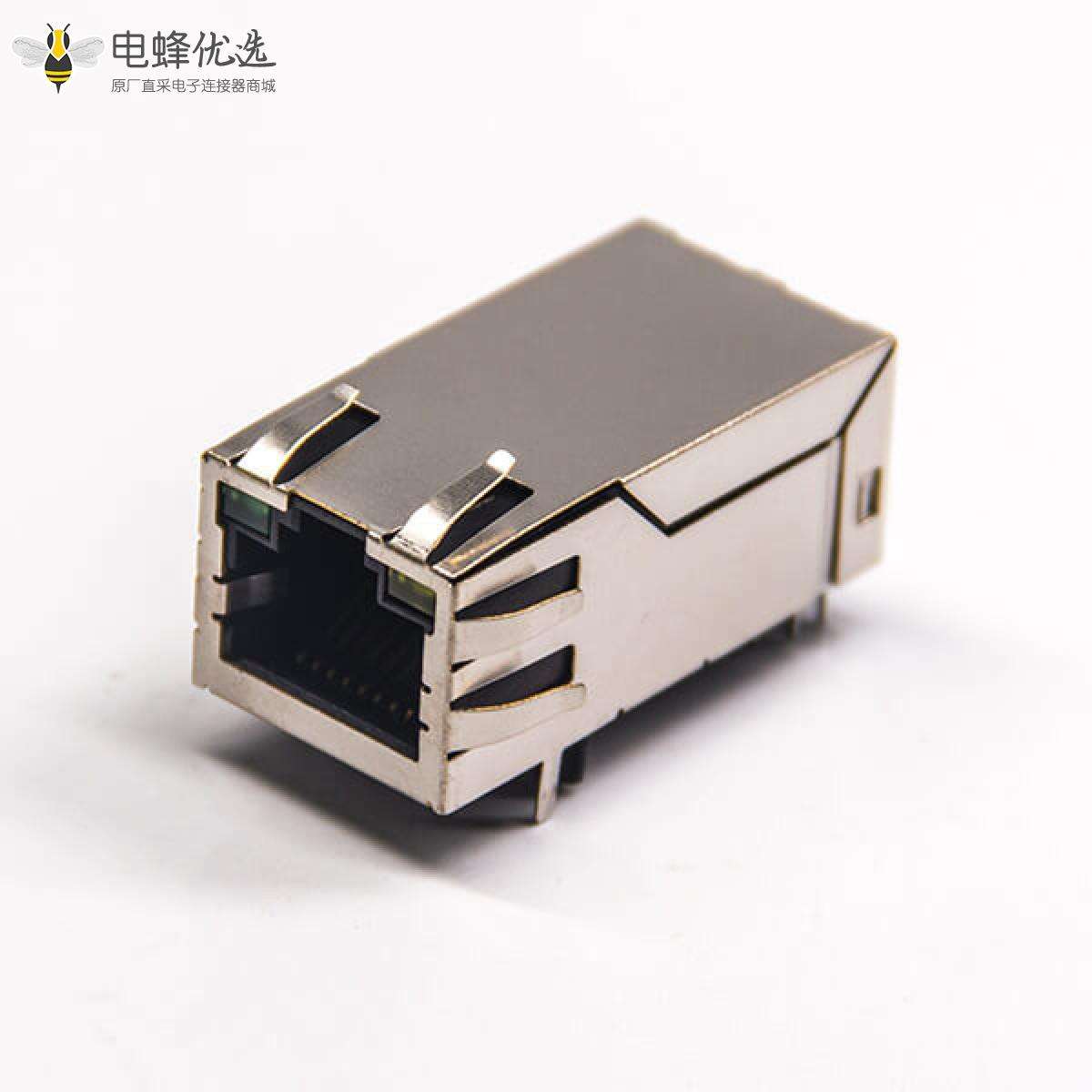 RJ45插座,8p8c,单口,1*1,弯式90º,触头镀金,插孔,PCB板安装,带屏蔽,带灯,带滤波;