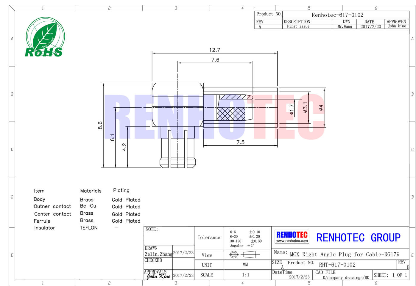 - mcx连接器,同轴线缆,公头,50欧,弯式,179,压接