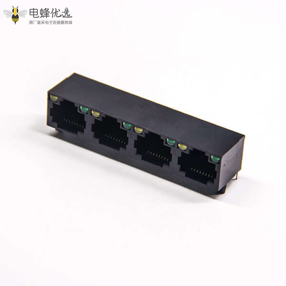 RJ45插座,8p8c,4端口,1*4,弯式90º,触头镀金,插孔,PCB板安装,不带屏蔽,带灯,不带滤波;