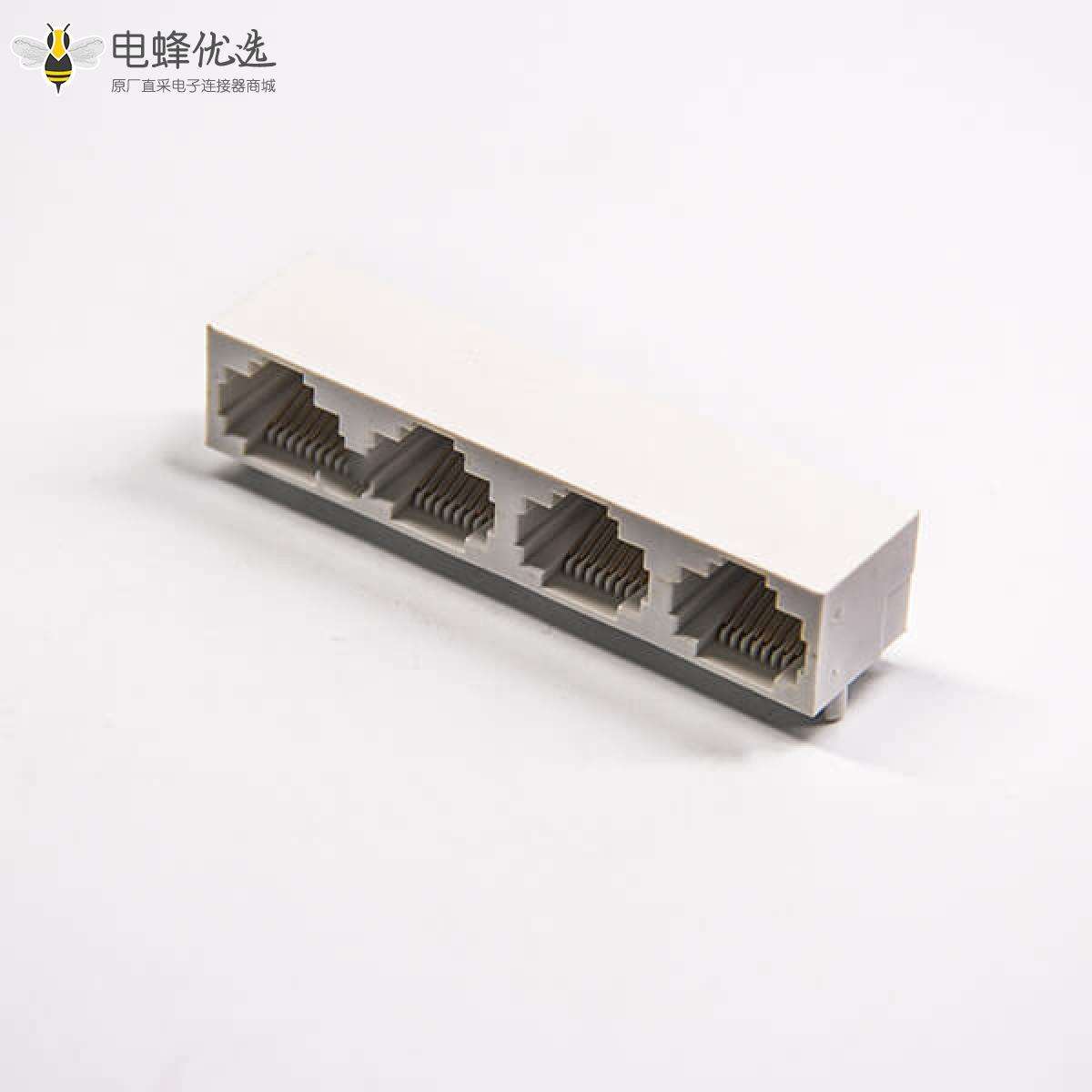 RJ45插座,8p8c,4端口,1*4,弯式90º,触头镀金,插孔,PCB板安装,不带屏蔽,不带灯,不带滤波;