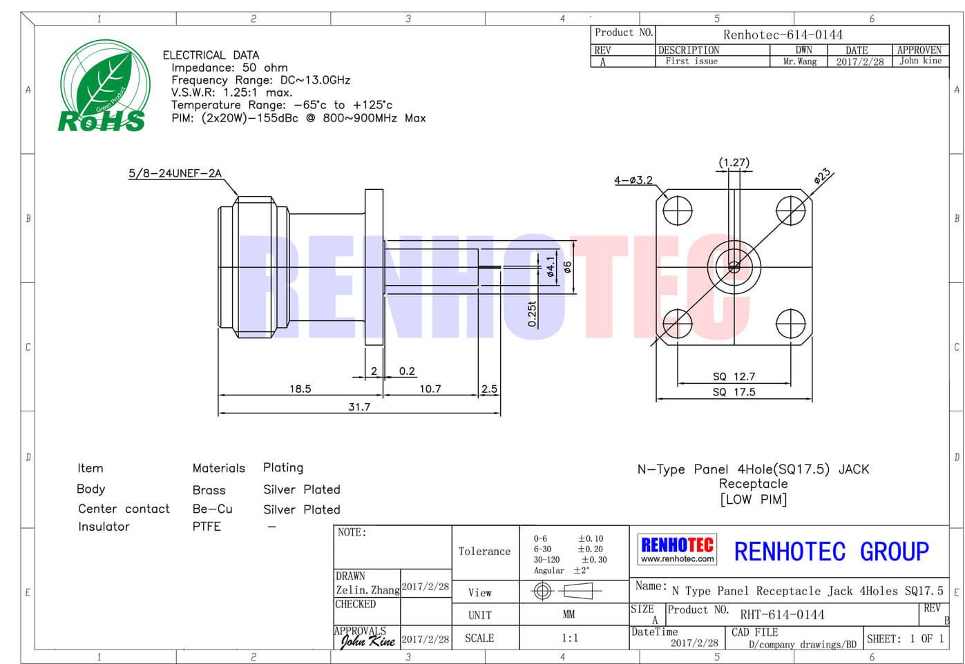 - n连接器,母头,50欧,直式,4孔法兰,面板安装;