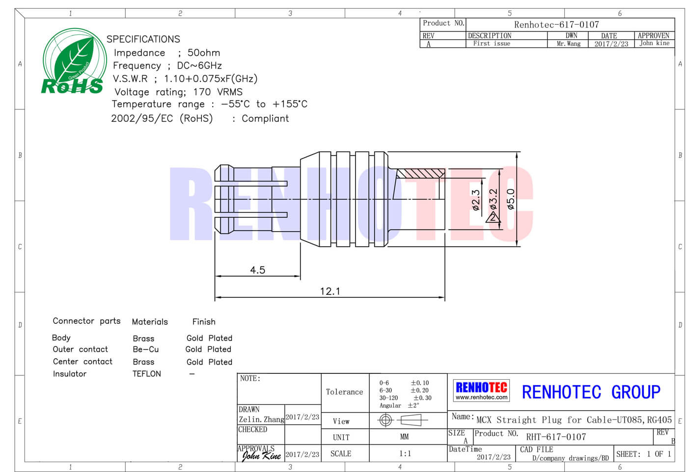 - mcx连接器,同轴线缆,公头,50欧,直式,UT085,RG405,焊接