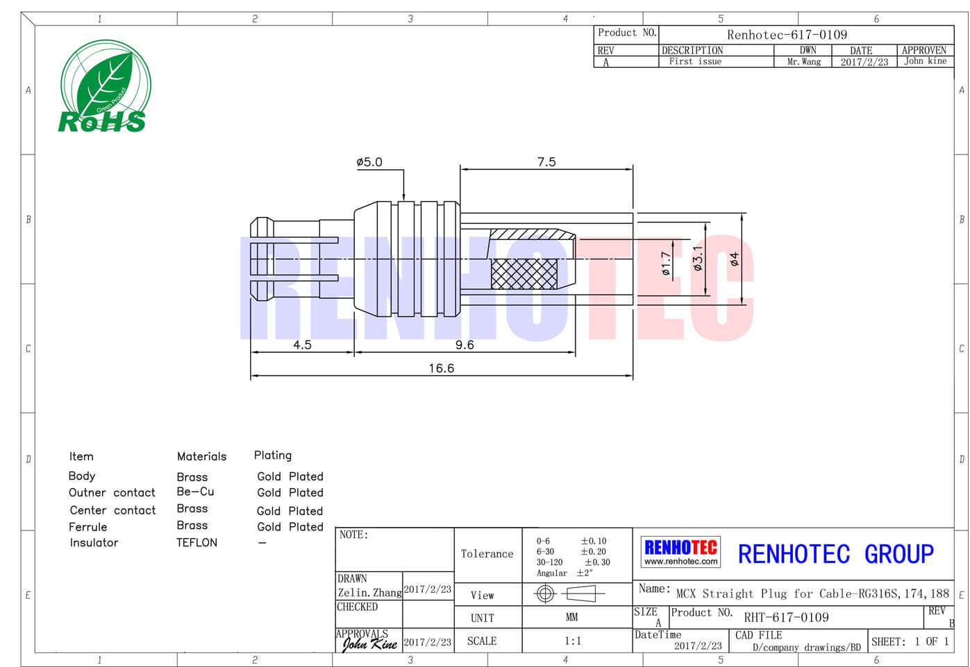 - mcx连接器,同轴线缆,公头,50欧,直式,RG316S,174,188,压接;