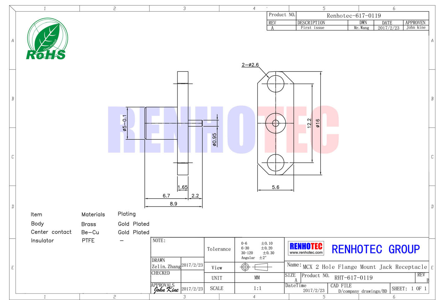 - mcx连接器,2孔法兰,母头,50欧,直式,面板安装;
