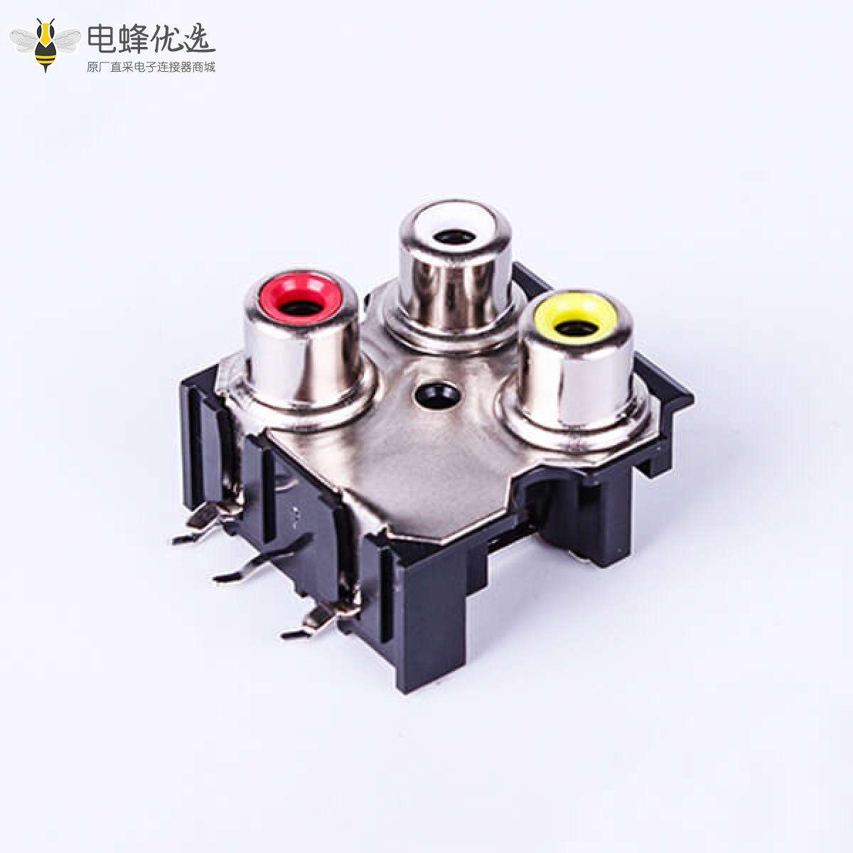 RCA连接器,母,插座,90°弯式,3孔,接板,插板,黑色塑胶,ABS.PBT,镀镍;