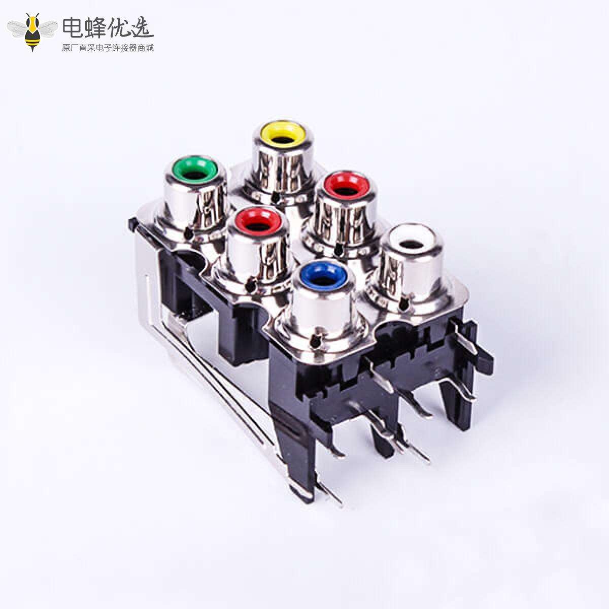 RCA连接器,母,插座,90°弯式,6孔,2*3,接板,焊板,黑色塑胶,ABS.PBT,镀镍;