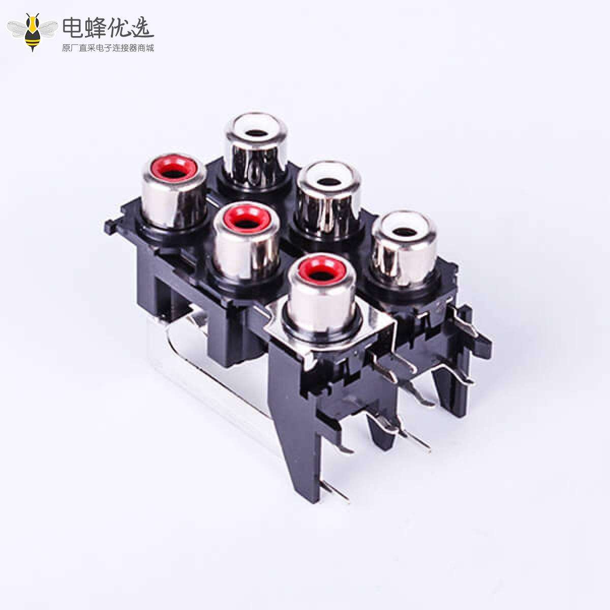 RCA连接器,母,插座,90°弯式,6孔,2*3,接板,焊板,黑色塑胶,ABS.PBT,镀镍;