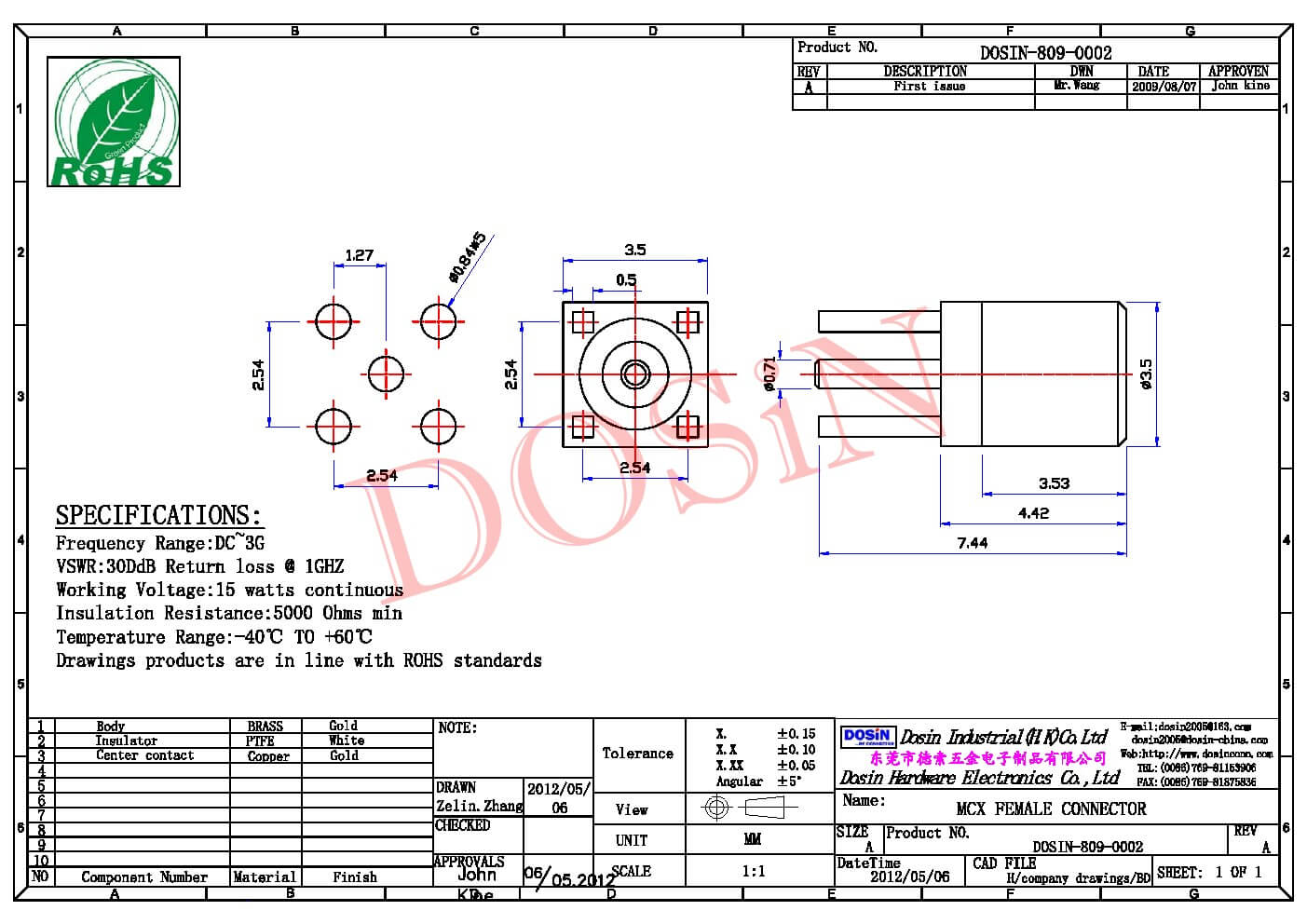 - 中心接触电阻: ≦ 5.0 mΩ (Milliohms max.)