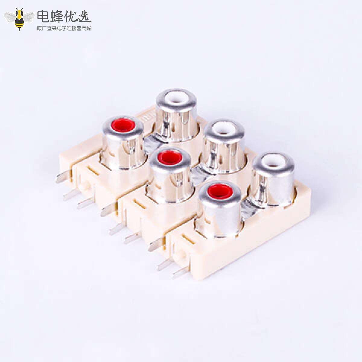 RCA连接器,母,插座,90°弯式,6孔,2*3,接板,焊板,白色塑胶ABS.PBT,镀镍;