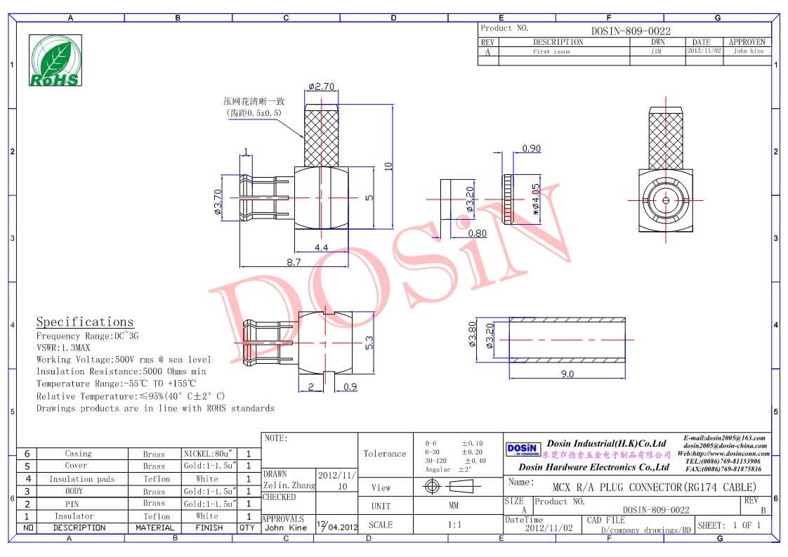 - 中心接触电阻: ≦ 5.0 mΩ (Milliohms max.)