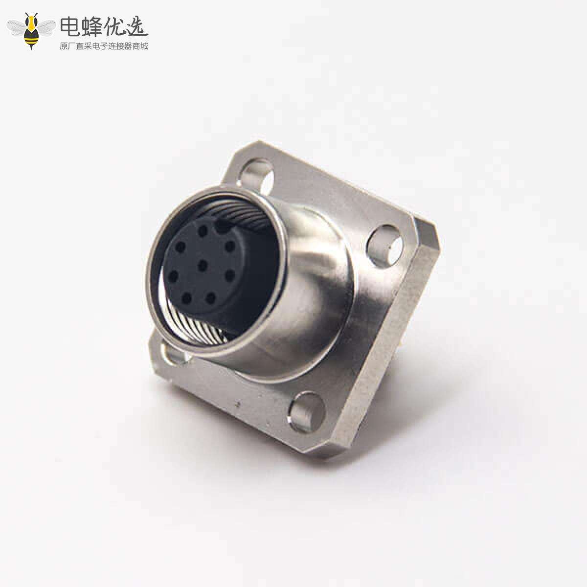 M12,板端插座,A编码,8芯,直式,母头,4孔法兰,面板安装,焊线;
