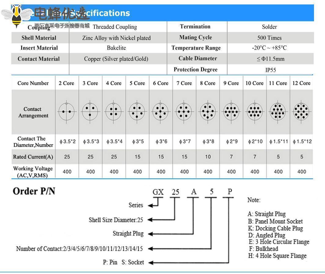 - GX25,反装款,插座,,2芯,母头,直式,接线;