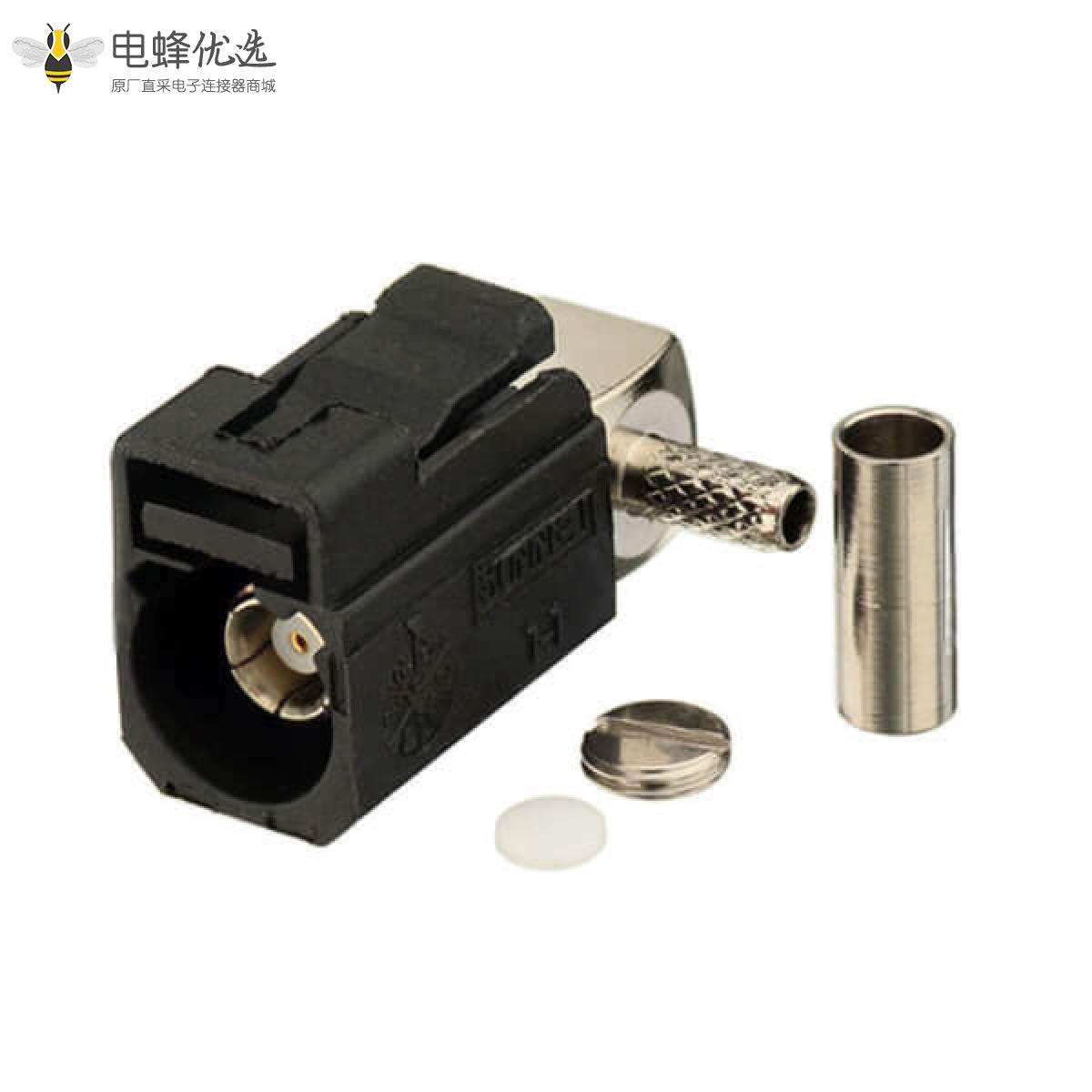 - RF连接器,Fakra连接器,母,弯式,50欧姆,焊接,压接,接线,RG174,RG316,黄铜,镀镍;