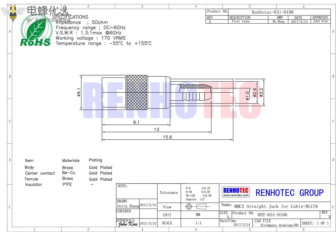 - mmcx连接器,同轴线缆,母头,50欧,直式,压接,RG178;
