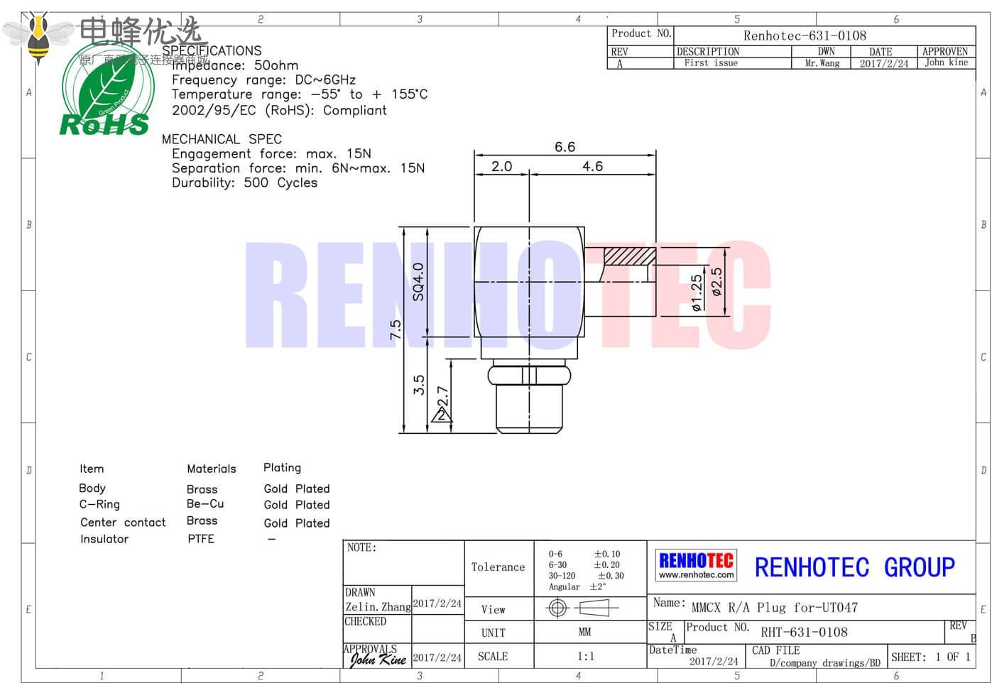 - mmcx连接器,同轴线缆,公头,50欧,弯式,焊接,UT047;