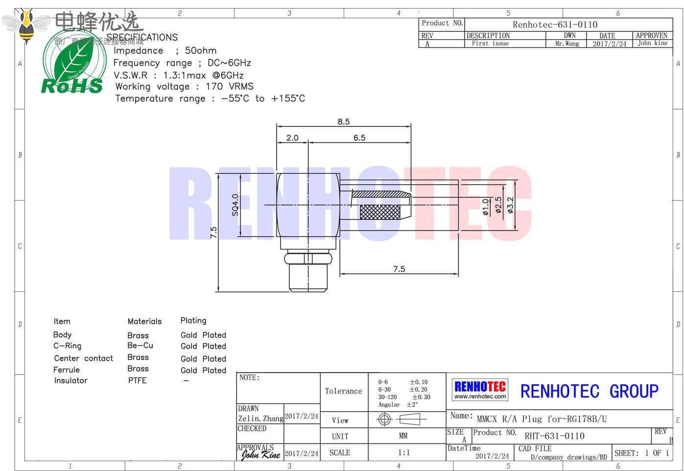 - mmcx连接器,同轴线缆,公头,50欧,弯式,压接,UT085;