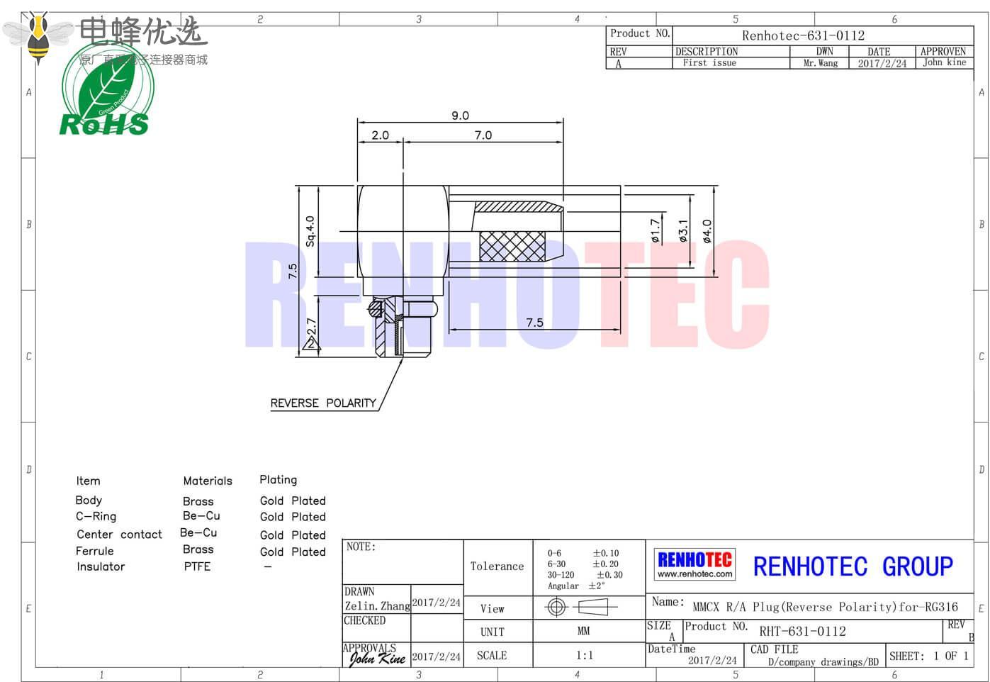 - mmcx连接器,同轴线缆,插头50欧,弯式,压接,RG316,反极;