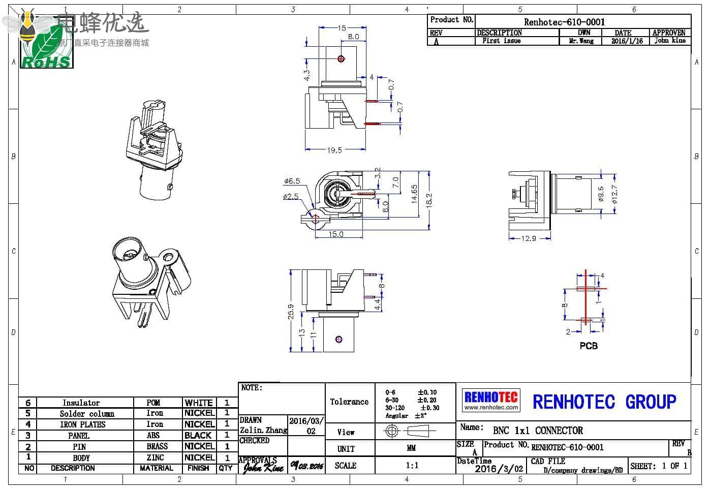 - PCB板端,母头,弯式,黑色塑胶外壳,RF射频同轴,BNC连接器,50欧姆;