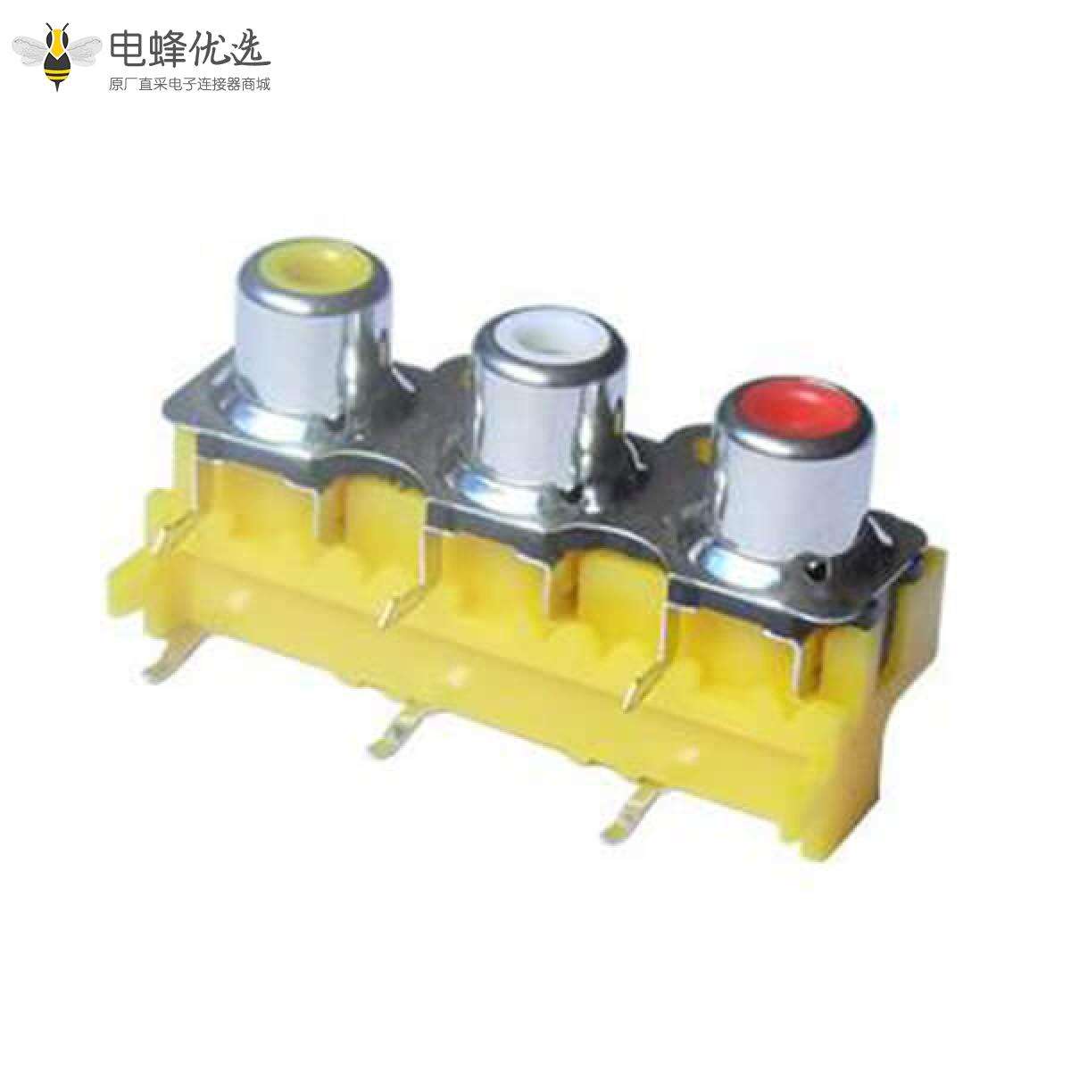 RCA连接器,母,插座,90°弯式,3孔,1*3,接板,插板,带金属屏蔽,黄色塑胶,ABS.PBT,镀镍;