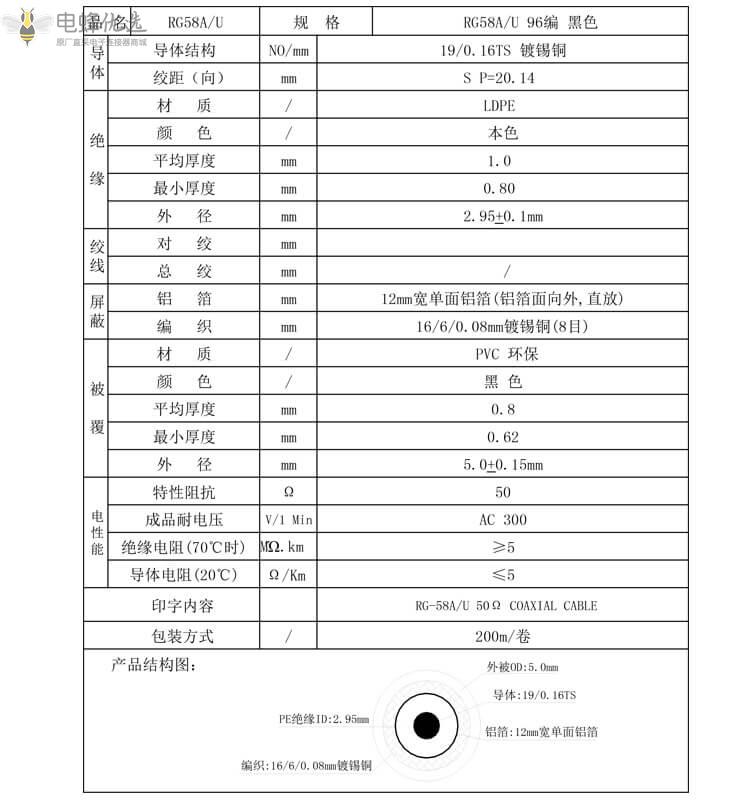 - RF同轴线材,RG58A/U,96编,黑色,射频同轴线缆;