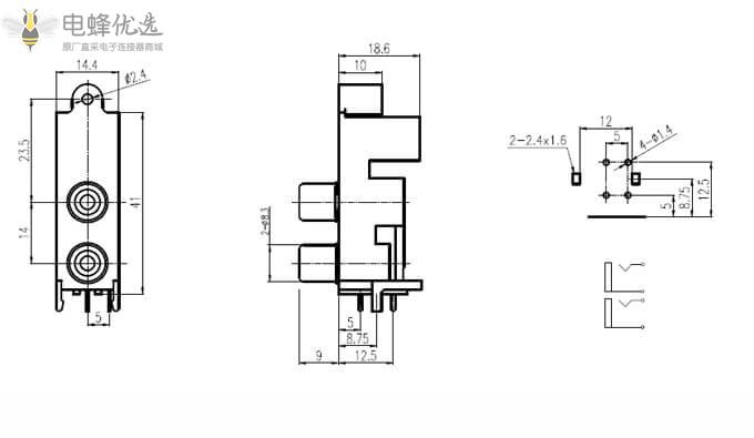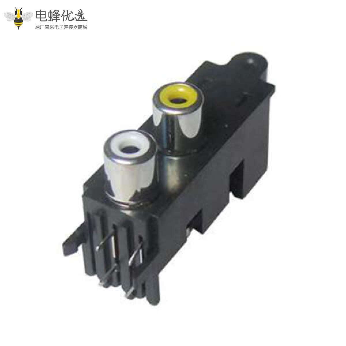 RCA连接器,母,插座,90°弯式,2孔,2*1,接板,插板,带螺丝孔,黑色塑胶,ABS.PBT,镀镍;