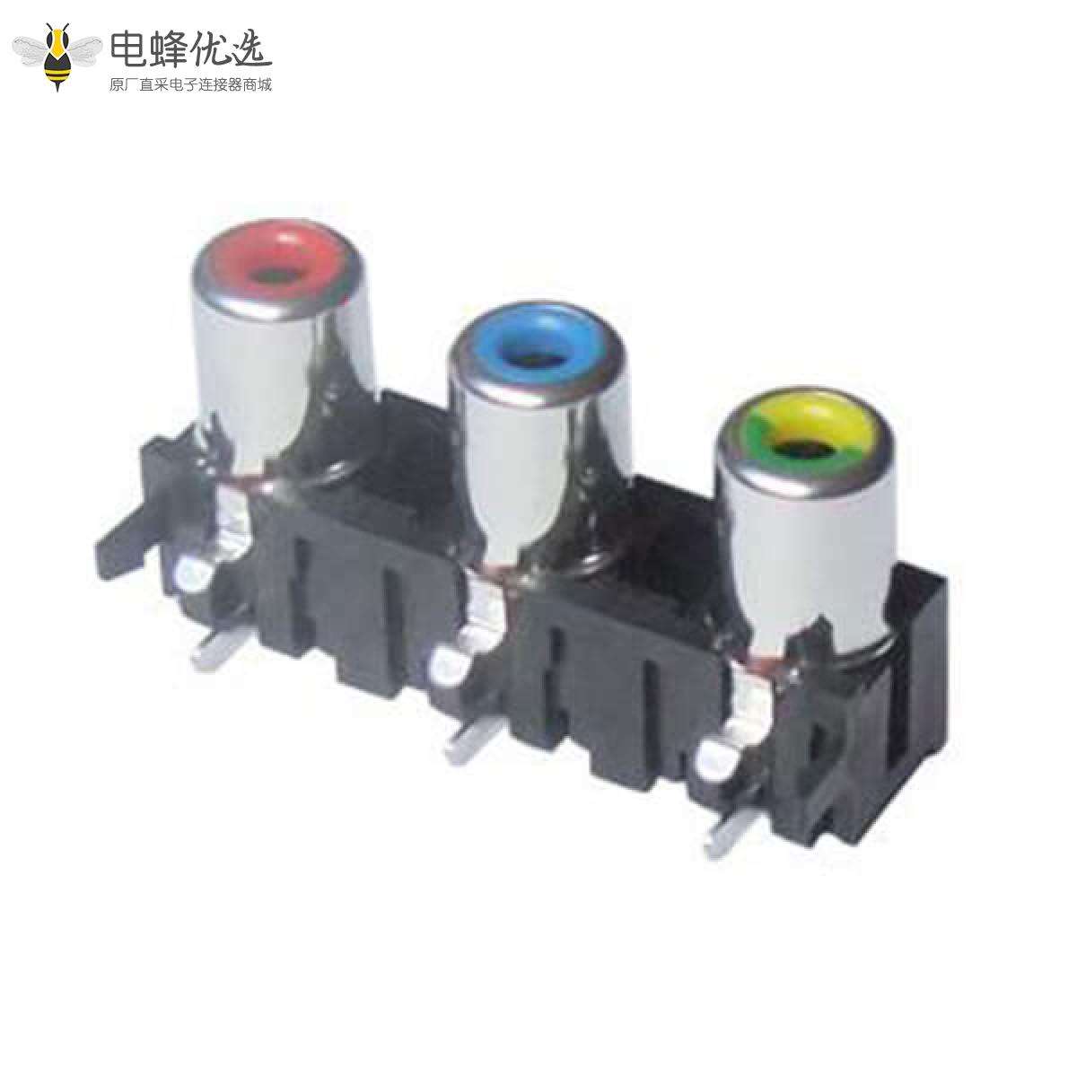 RCA连接器,母,插座,90°弯式,3孔,1*3,接板,插板,黑色塑胶,ABS.PBT,镀镍;