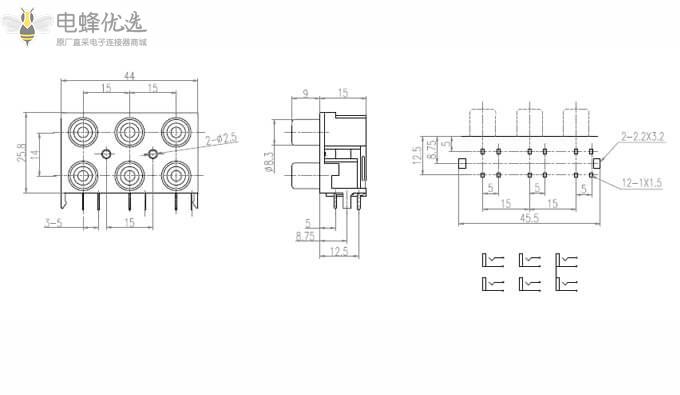 RCA连接器,母,插座,90°弯式,6孔,2*3,接板,插板,不带屏蔽,黑色塑胶,ABS.PBT,镀镍;