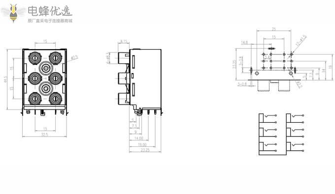 描述:产品特征:RCA连接器,母,插座,90°弯式,6孔,3*2,接板,插板,带金属屏蔽,黑色塑胶,ABS.PBT,镀镍;价格便宜,设计简单且方便安装;高质量原厂出货,30天无忧退换货;来自品牌OEM原厂批发,相同质量,更实惠的价格。应用:交通:汽车、摩托车家电:彩电、冰箱、VCD、DVD、投