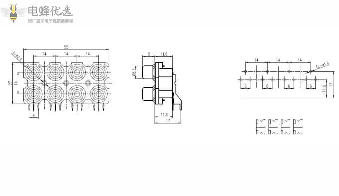 RCA连接器,母,插座,90°弯式,8孔,2*4,接板,插板,带金属屏蔽,黑色塑胶,ABS.PBT,镀镍;