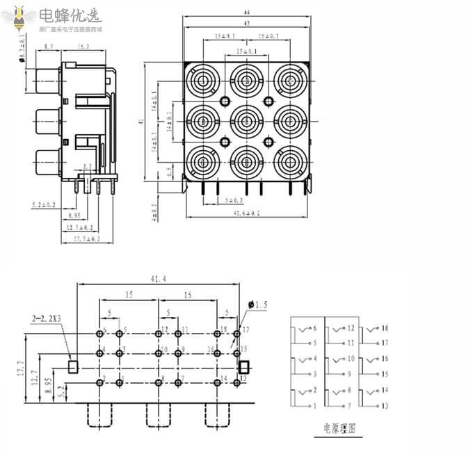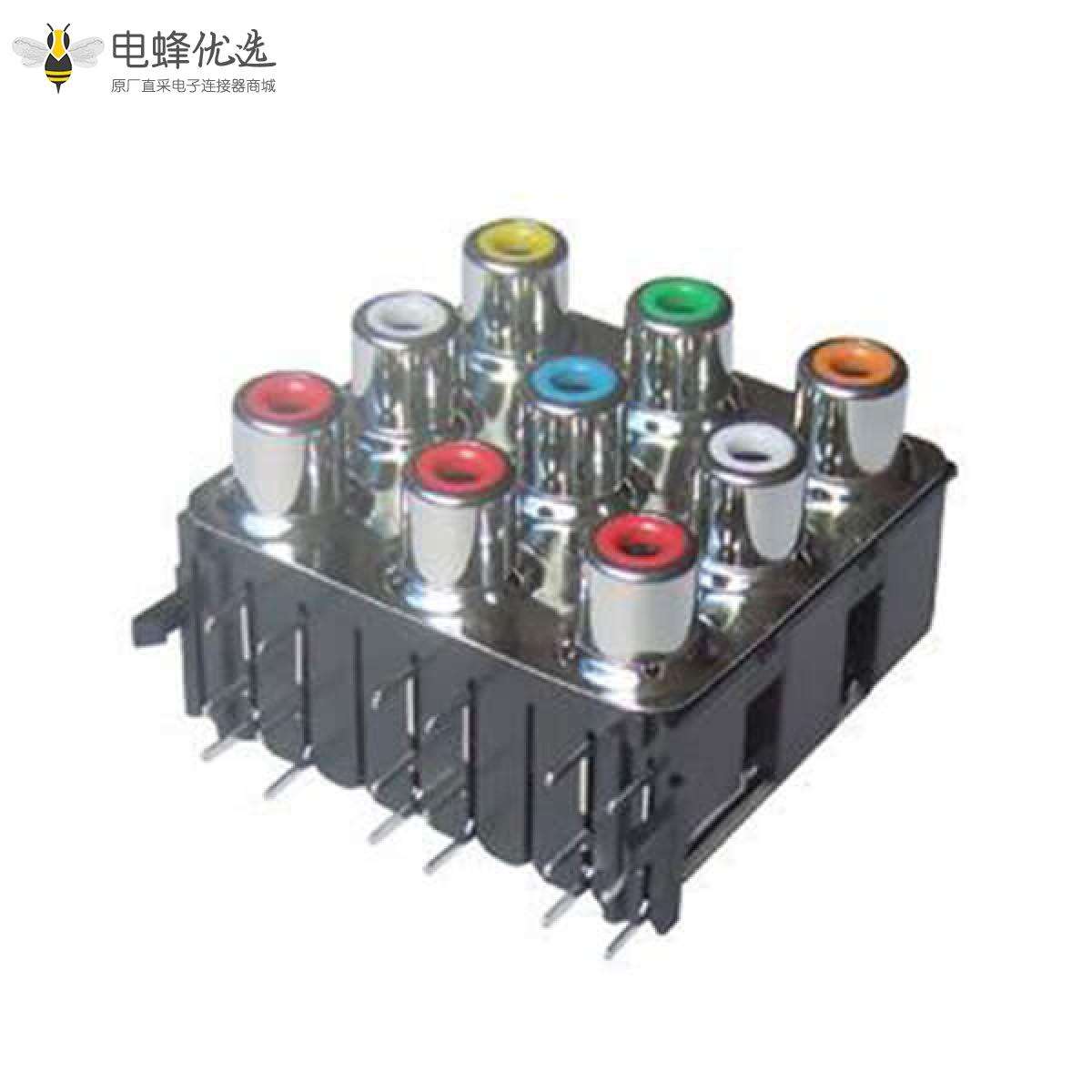 RCA连接器,母,插座,90°弯式,9孔,3*3,接板,插板,带金属屏蔽,黑色塑胶,ABS.PBT,镀镍;