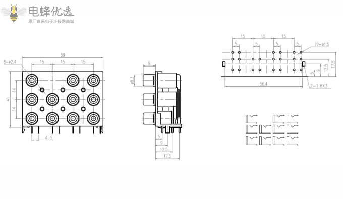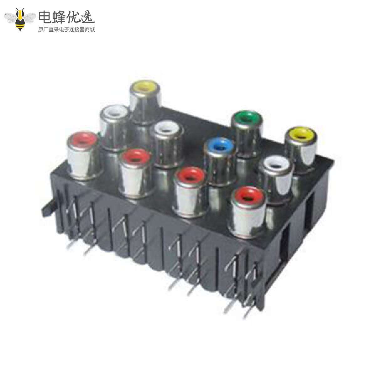 RCA连接器,母,插座,90°弯式,11孔,3排,接板,插板,不带屏蔽,黑色塑胶,ABS.PBT,镀镍;