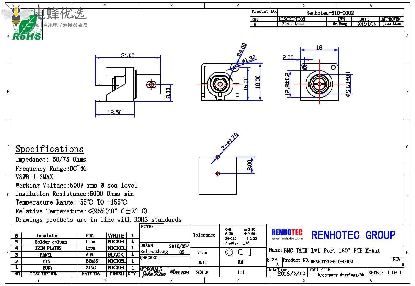 - PCB板端,母头,直式,黑色塑胶外壳,RF射频同轴,BNC连接器,50欧姆;