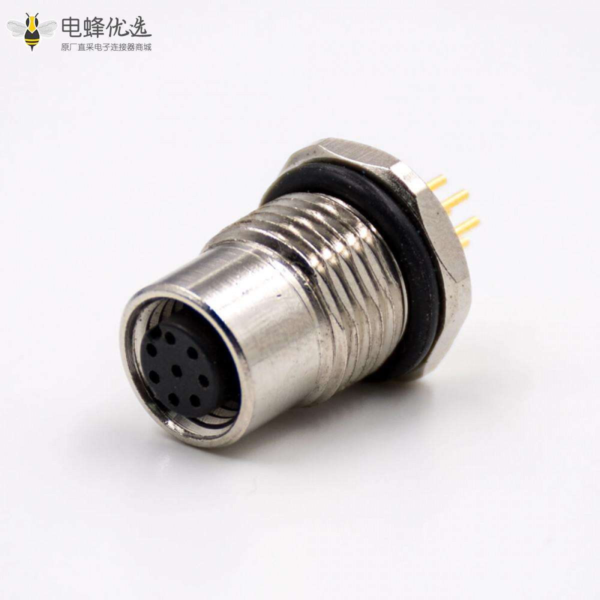 M12,8芯,A扣,板端插座,母头,直式,接PCB板,前锁板;