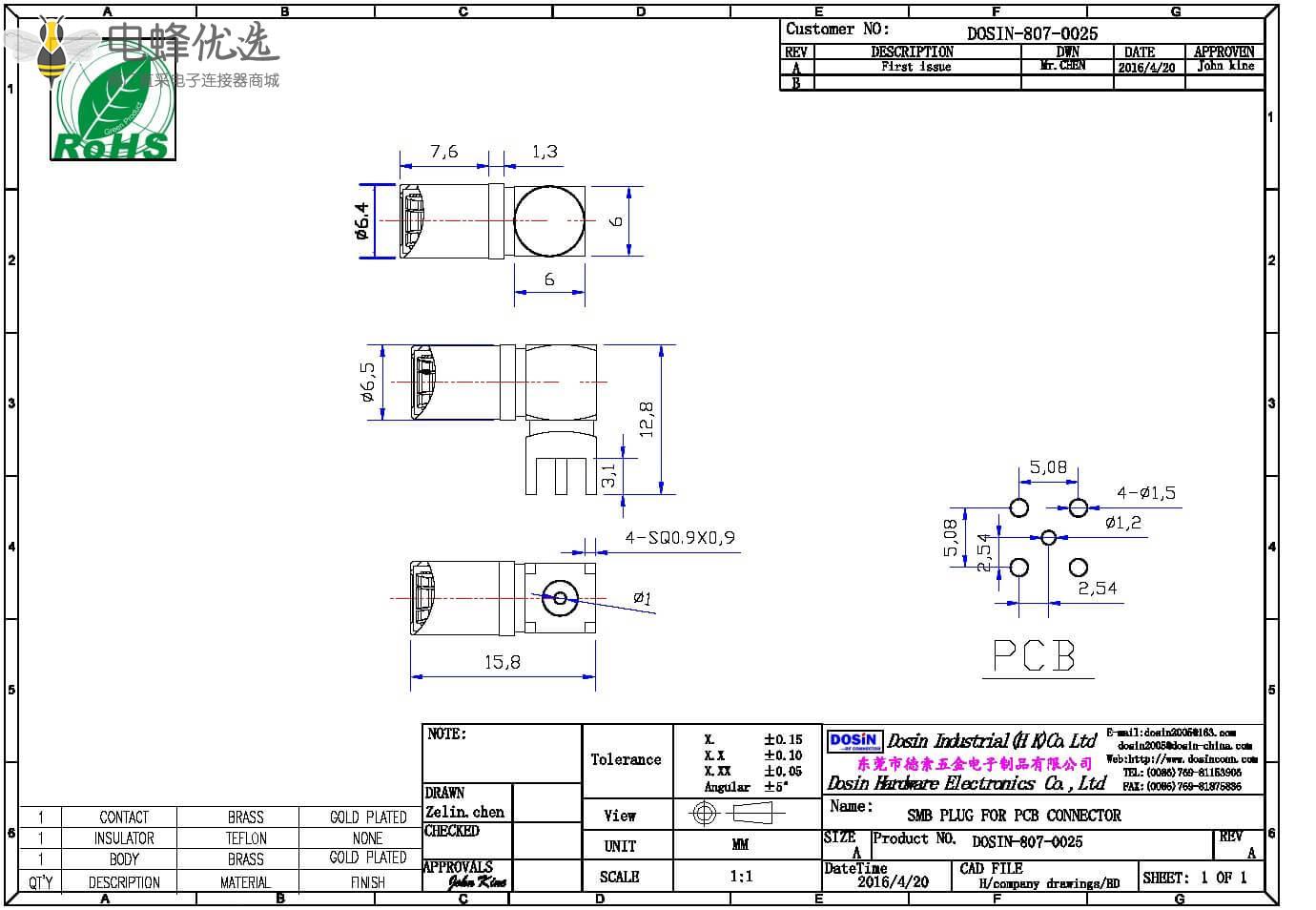 - PCB板端,公头,弯插,RF射频同轴,SMB连接器,50欧姆;